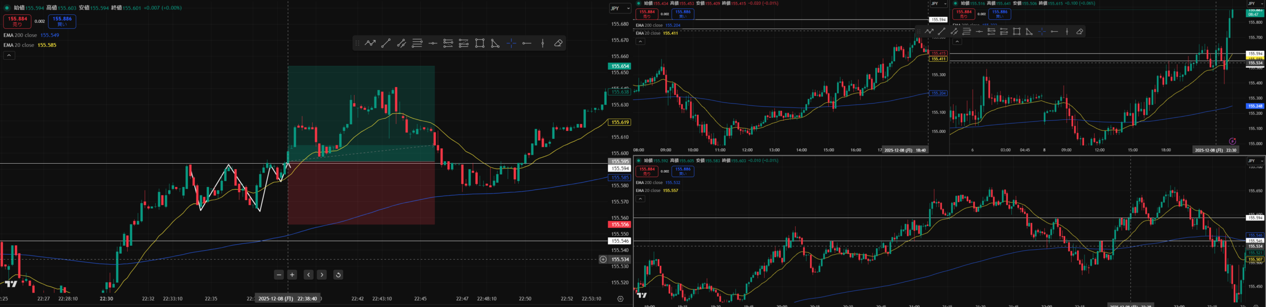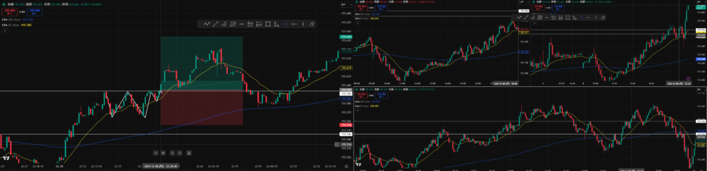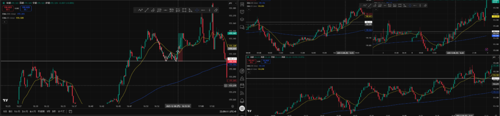3画面表示足→ 左上5分足 右上15分足 下1分足